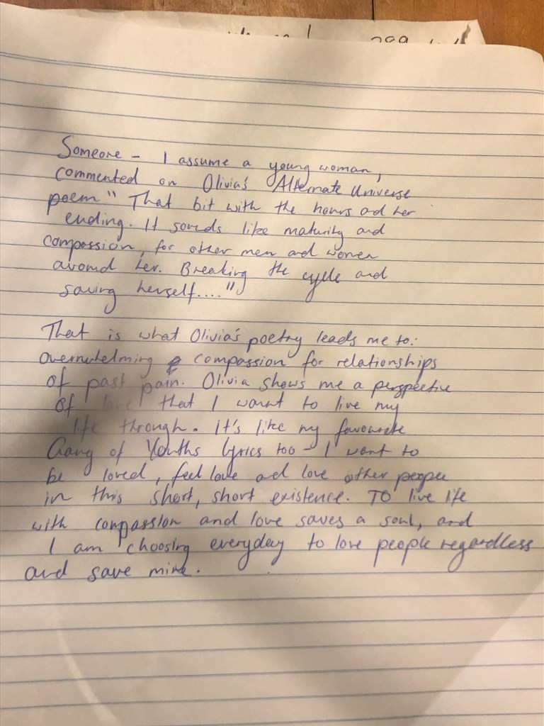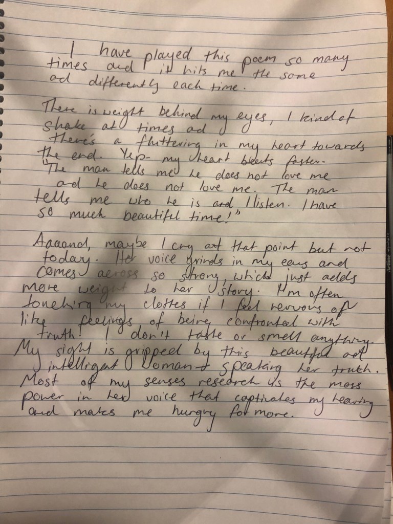 I chose Olivia Gatwood’s Alternate Universe Poem to write about here because, at face value, it spoke to where I was at with a relationship in my life. Secondly, Alternate Universe speaks greatly to a young woman’s experience in current Western culture and society. In turn, the feedback on my essay showed Gatwood’s strong-soft words resonated with young women. I have been analysing my own experience as a fan of her spoken word performance, and as a creator of an essay for spoken word fans, through autoethnographic journaling and notetaking.